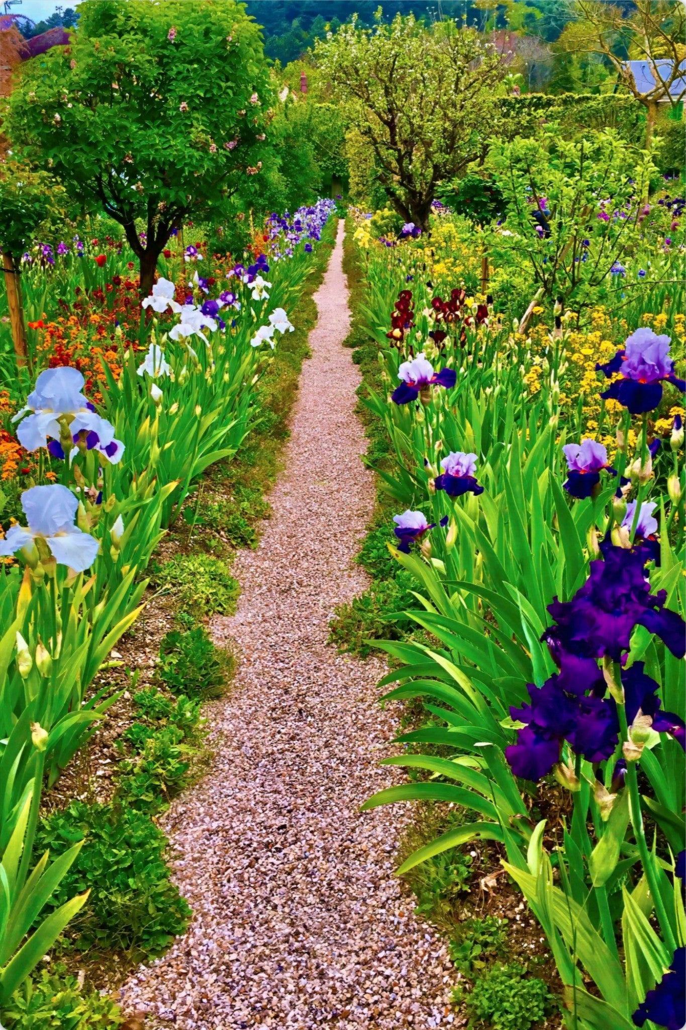 where irises stand like sentinels in violet and blue,